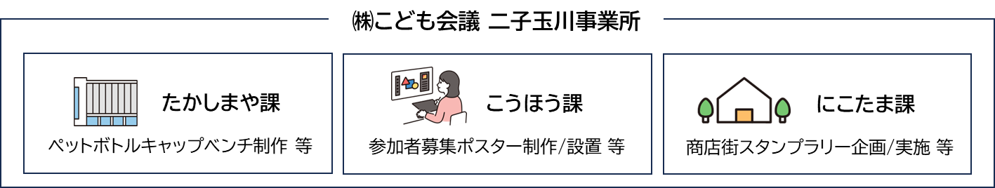 東神開発からの「おしごと」の依頼をきっかけに、2022年10月、地域事業所のひとつとして「二子玉川事業所」が開設されました。2024年度からは3つの課に分かれて活動領域を広げ、二子玉川の街を舞台に活動しています。
