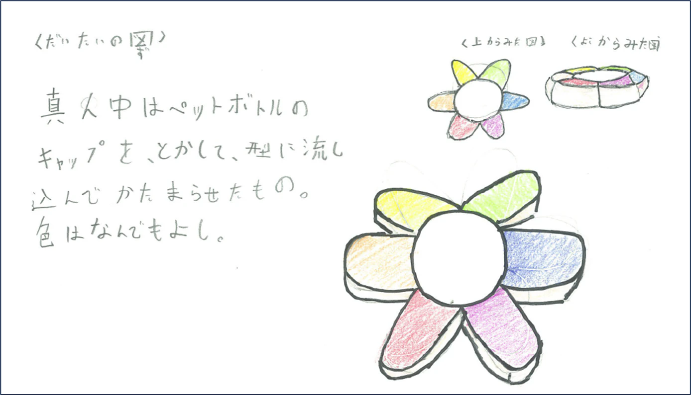 「みんなで集めたペットボトルのキャップをお花の形のベンチにしたい!」という子どもたちの企画をお聞きした時、私自身もその想いを形にしたいと強く感じ、参加させていただきました。製作では素材特性ならではの課題もありましたが、そのたびに提案してくれた子どもたちの笑顔を思い、前へ進む力になりました。このベンチは、子どもたち、大人たち、関わったすべての人の想いが集まって生まれた“ひとつの命”のように感じています。ここから多くの笑顔が広がり、次の循環へつながるきっかけとなることを心より願っています。