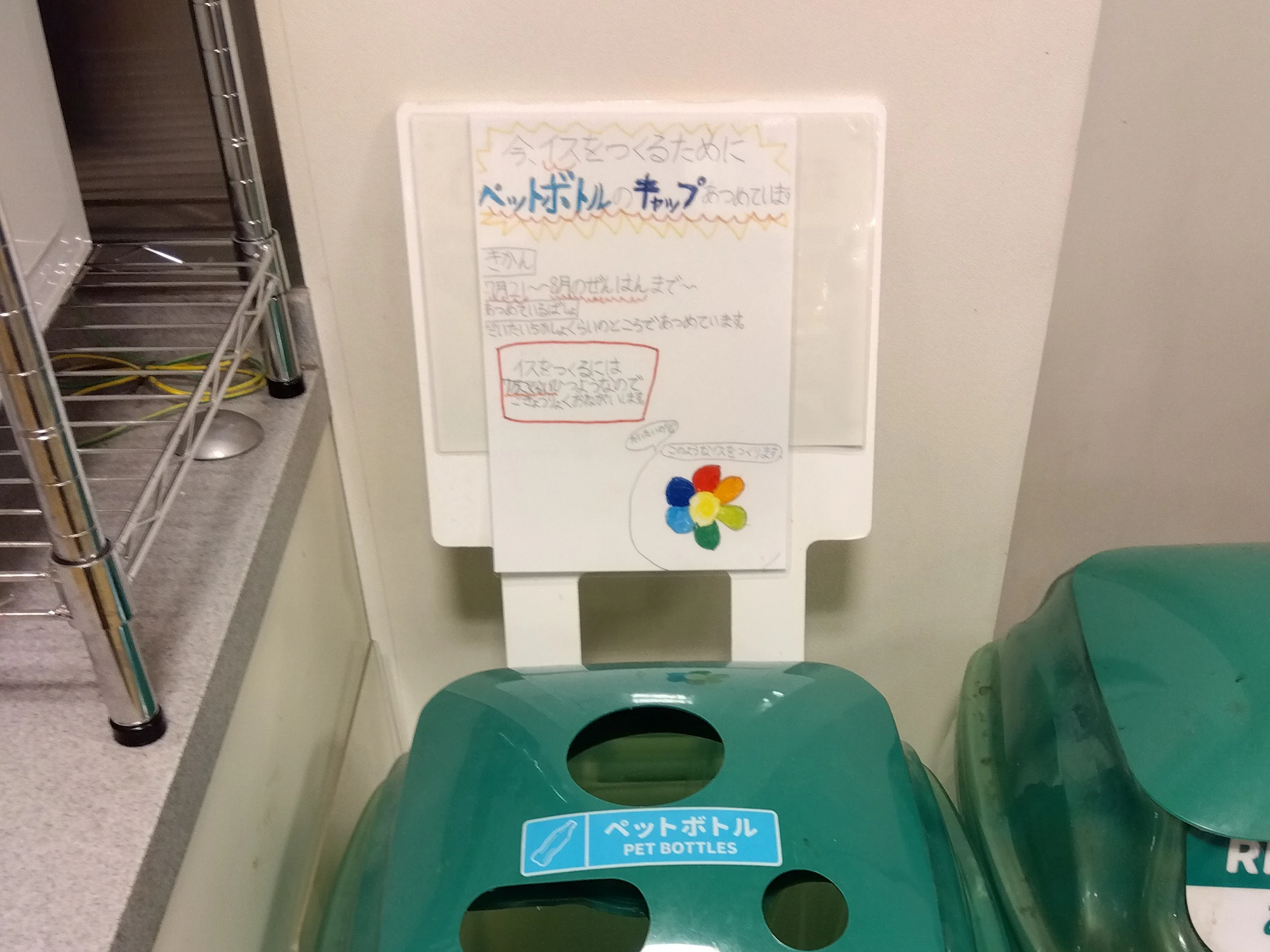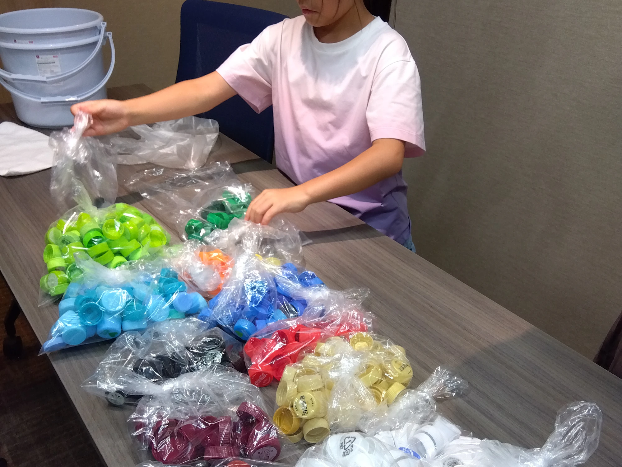 デザインが決まったら、次は制作に必要な材料集め。子どもたちは手書きでキャップ回収を呼びかけるPOPを制作し、バックヤードのキャップ回収箱に設置。集まったキャップは、ベンチの素材の一部として使用できるよう洗浄し、自分たちの手で色別に仕分けました。
