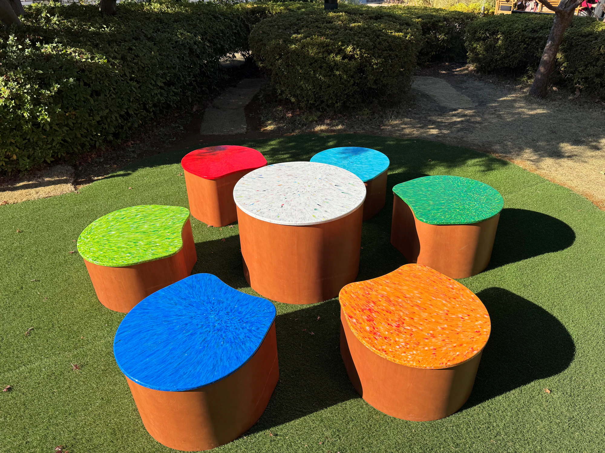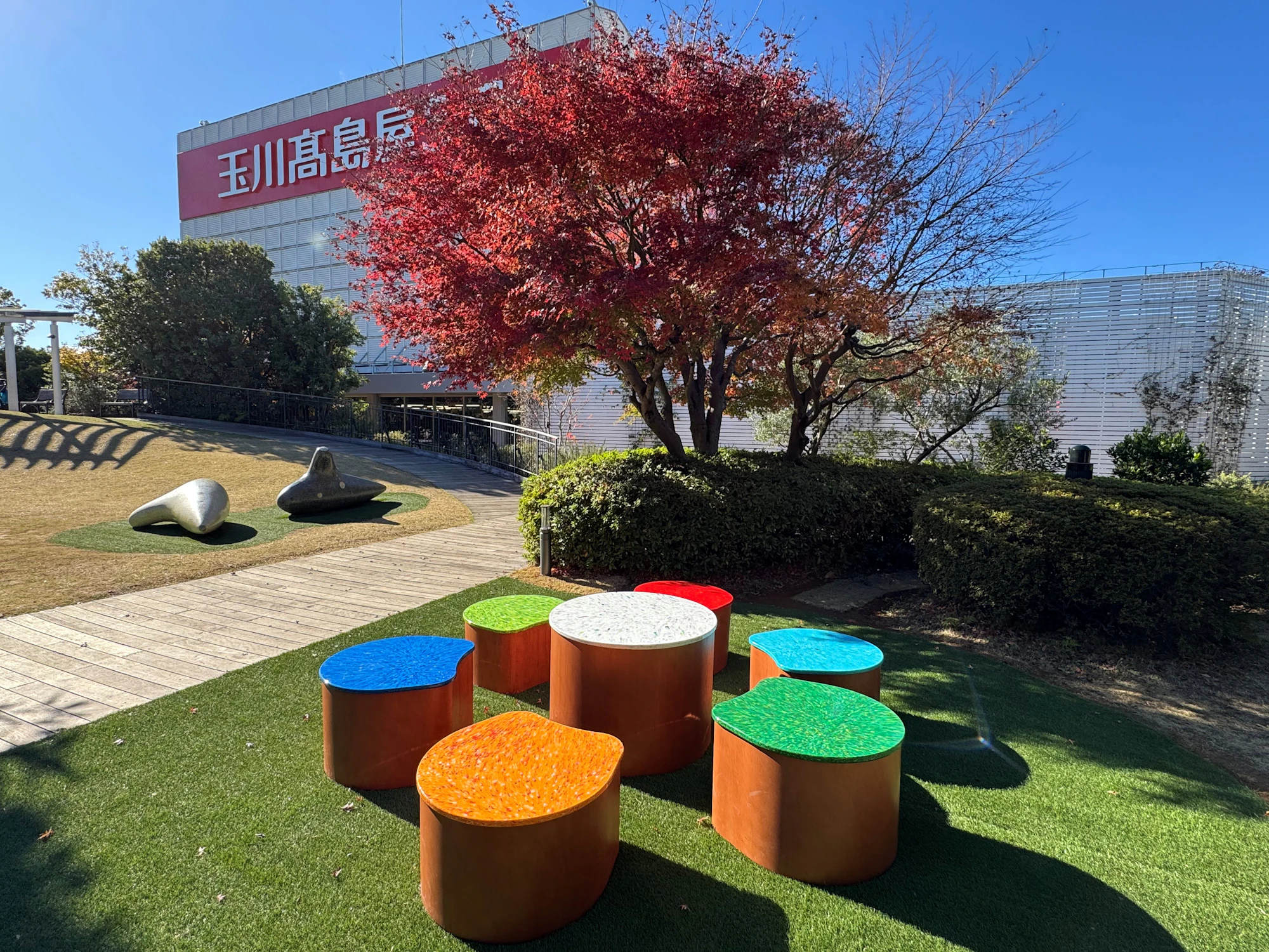 2025年11月、「こども会議 二子玉川事業所」と共創して、玉川髙島屋S.C.の本館屋上に約2万個のペットボトルキャップを使用した「花びらベンチ」を設置しました。