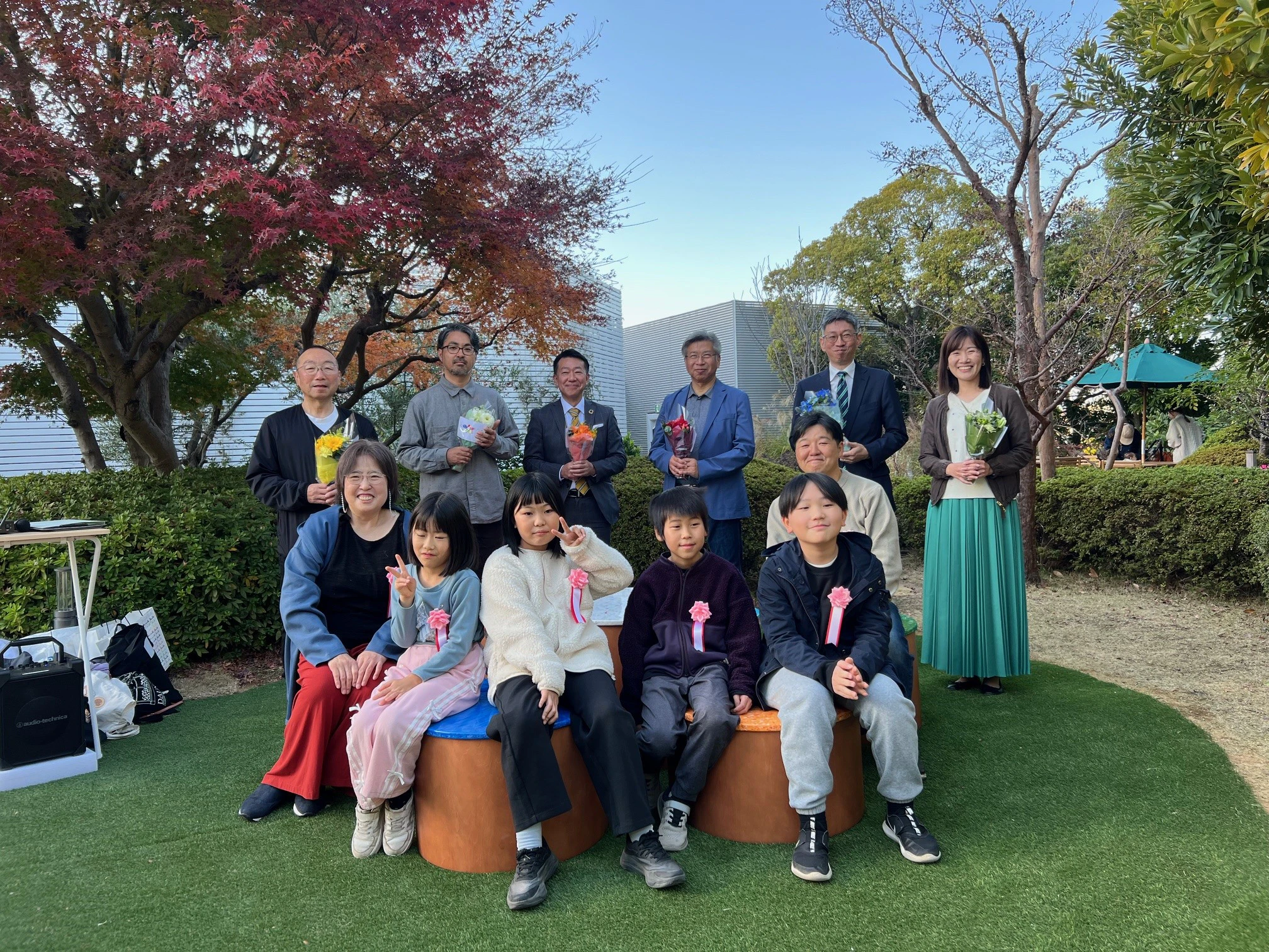 高く澄んだ空が広がる穏やかな秋晴れの日、本館屋上で「花びらベンチ」のお披露目会が催されました。当日集まったのは総勢30名。およそ8か月前に”こども社員”からプレゼンを受けた、東神開発の”おとな社員”も立ち会いました。