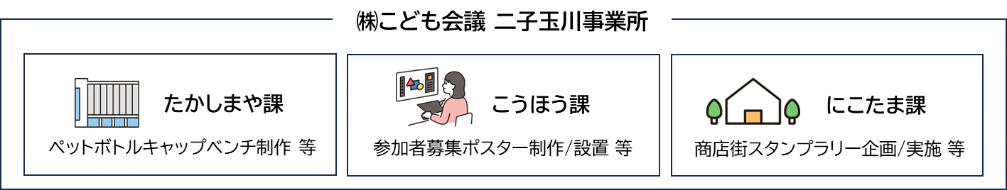東神開発からの「おしごと」の依頼をきっかけに、2022年10月、地域事業所のひとつとして「二子玉川事業所」が開設されました。2024年度からは3つの課に分かれて活動領域を広げ、二子玉川の街を舞台に活動しています。